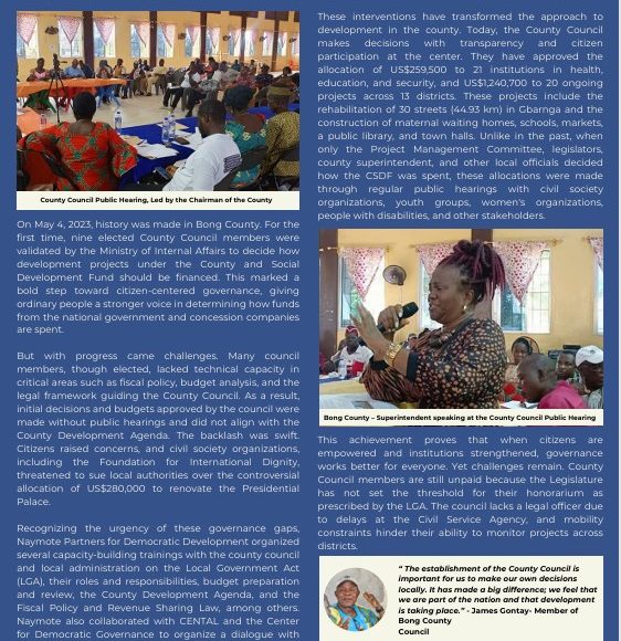 On May 4, 2023, history was made in Bong County. For the first time, nine elected County Council members were validated by the Ministry of Internal Affairs to decide how development projects under the County and Social Development Fund should be financed. This marked a bold step toward...Read More